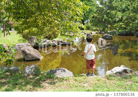 虫取り網を持って池の生き物を探す男の子の後ろ姿