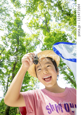 雑木林でカブトムシを持つ男の子