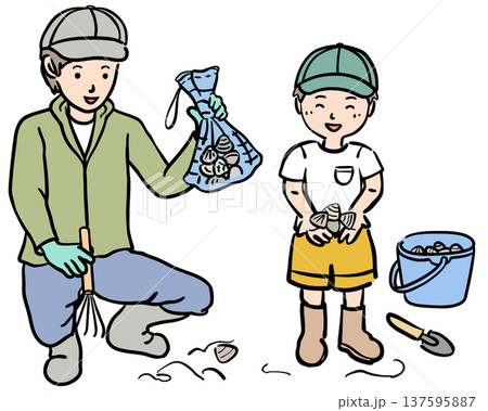 潮干狩りをする親子のイラスト