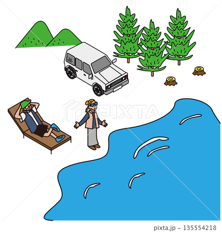 アウトドアでくつろぐチルな時間を表現した人物と車のイラスト素材