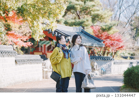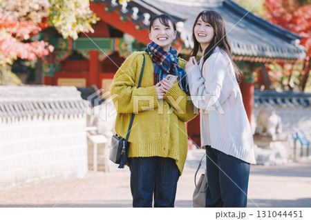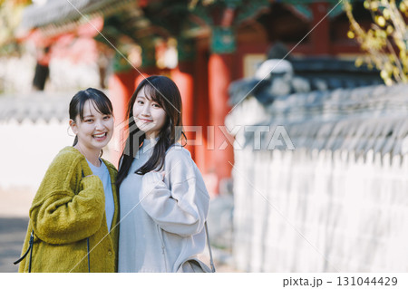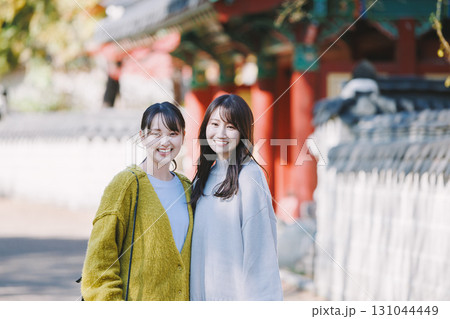 女子旅 カメラを持って大阪城公園を観光する若い女性