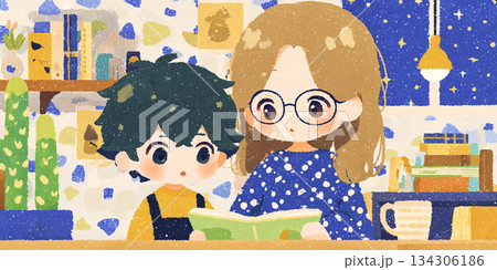 本を読む男女2人のイラスト