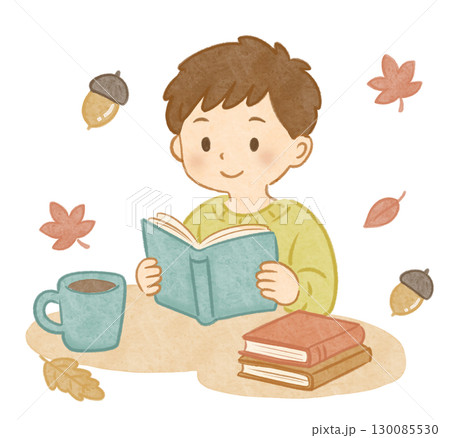 読書の秋 秋を楽しむ男の子 シンプルでかわいい水彩風手描きイラスト