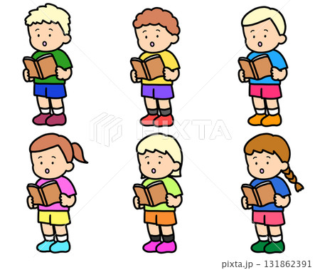 本を読む子どもたちのイラストセット 手書き感あるシンプルでかわいいイラスト