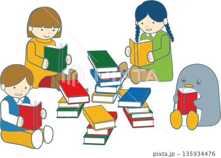 本を読む子どもたちのイラスト/読書・学習・教育素材