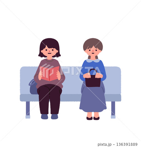 ベンチで順番を待つ女性たちのイラスト|待合室・受付・公共施設