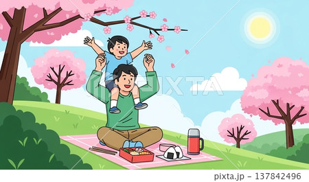 お花見を楽しむ人々のイラスト|桜の下でピクニックする家族と友人の春の風景