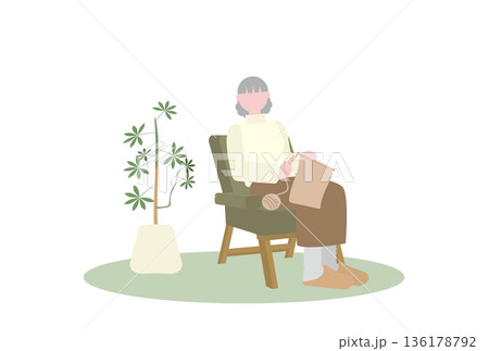 美優シリーズ:椅子に座って編み物をするシニア女性|やさしい暮らしを描くフラットイラスト