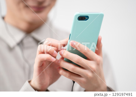 ワイヤレスイヤホンで音楽を聴く若い男性