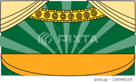 「JUNK FOOD」の電飾看板とカーテンをあしらった劇場風のサンバースト背景イラスト