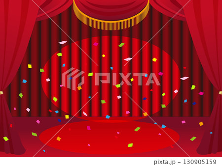 紙吹雪が舞いスポットライトが当たる赤いカーテンの舞台