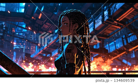 近未来的な光輪を背に、編み髪の戦士の少女が鋭い眼差しで正面を見据え、静かな闘志を漂わせて立つ姿