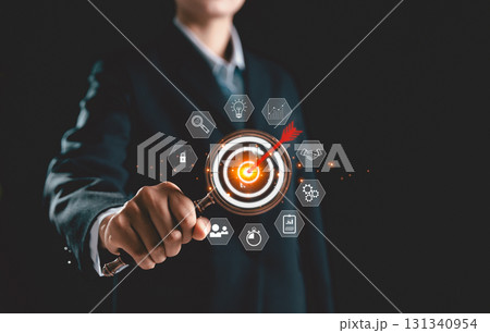 Targeting business concept, Strategic planning for business growth and target customer group, set up business objective target goal, Businessman point virtual target icons for business objective.