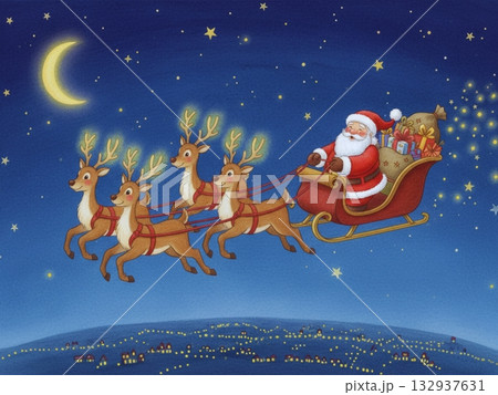 トナカイのそりで空を飛ぶサンタクロースの水彩イラスト背景素材