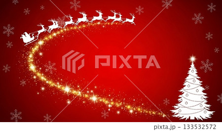 赤い背景に輝く光の軌跡とサンタクロースのそり、白いクリスマスツリー