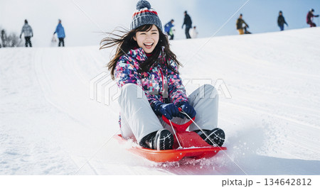 雪上でプラスチックそりに乗る女性