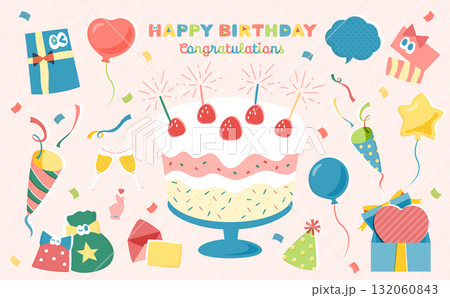誕生日ケーキやプレゼント、風船、クラッカー、ハッピーバースデーの文字などのベクターイラスト素材