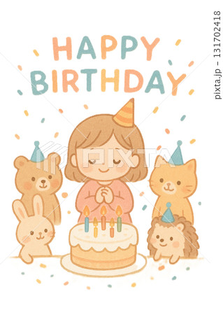 誕生日ケーキで喜ぶ女の子と動物たち