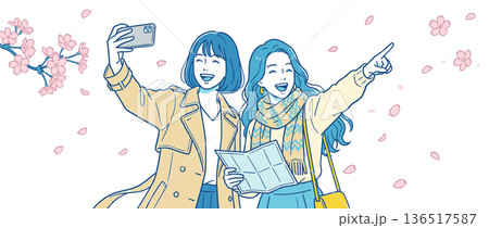 桜を背景にセルフィーを撮る観光中の女性二人 女子旅・花見イメージ