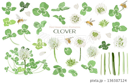 水彩で描いたクローバー(シロツメクサ)のパーツ素材セット