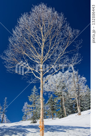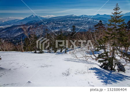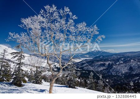 残雪期の尾瀬・至仏山山頂の樹氷と平ヶ岳の眺め