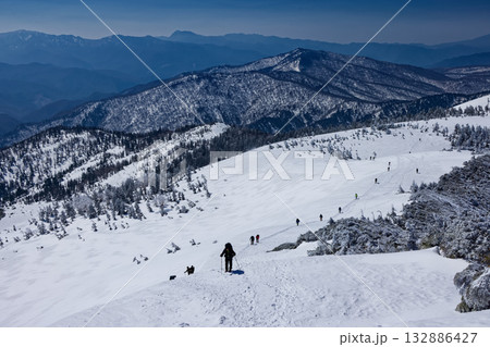 残雪期の小至仏山から見る見る鳩待峠からの登山者の列
