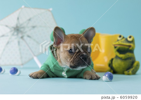レインコートを着て伏せるフレンチブルドッグ