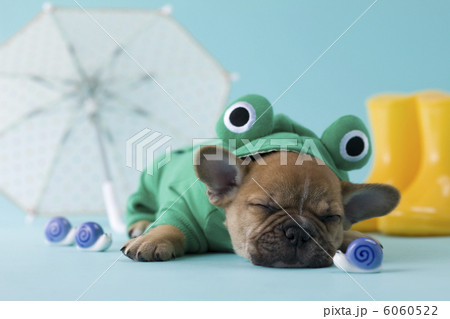 レインコートを着て眠るフレンチブルドッグ