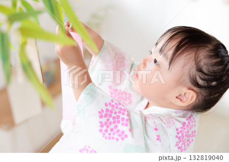 七夕 笹の葉に短冊を飾り付ける2歳の女の子 願い事 笹飾り 願いごと 一夜飾り