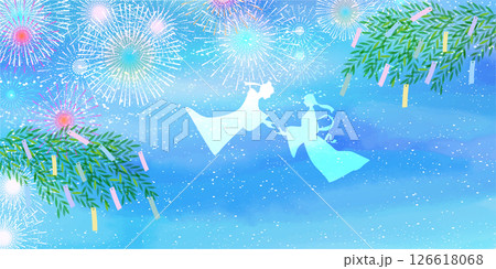 天の川を挟んだ織姫彦星_七夕笹飾り入り