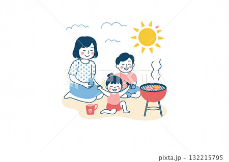 海の日に海辺で遊ぶ家族 ピクニック