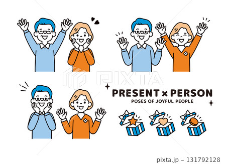 贈り物と、嬉しそうな表情・ポーズの老いた男性と女性の上半身ベクターイラスト素材セット_カラー