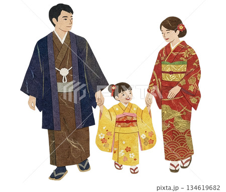 日本の七五三 日本の着物を着た家族 かわいいイラスト