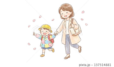 小学校の入学式の親子と桜の水彩イラスト