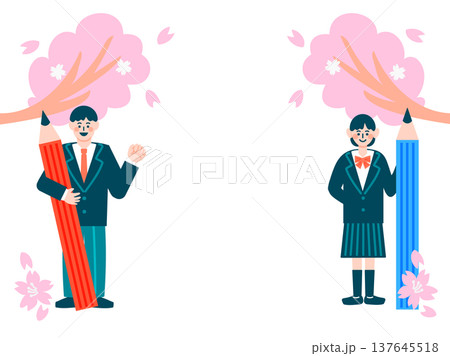 桜と鉛筆を持つ制服姿の中学生・高校生の男女のイラスト