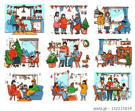 クリスマスを楽しむ幸せそうな家族のクリスマスイメージイラスト