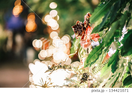 電飾のカラフルで美しい光の写真 幻想的なイルミネーション 冬 玉ボケ