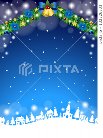 クリスマス背景、街並みシルエット、青、オーナメント、かわいい、イラスト、縦