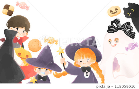 ハロウィンの仮装をした子供たちとお菓子のフレーム