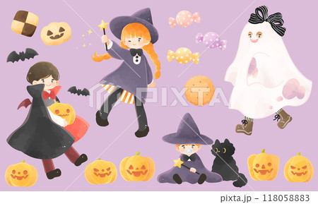 おばけや魔女の衣装を着たかわいい子供たちのハロウィンイラスト