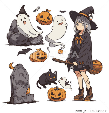 ほうきを持つ魔女の女の子と、かわいいおばけのハロウィンイラスト