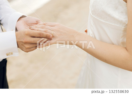 結婚式場で指輪交換する新郎新婦(結婚指輪・マリッジリング・・ウェディング・ブライダル)