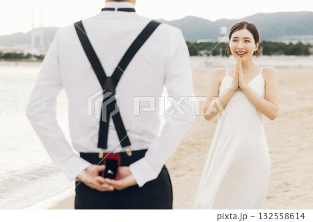海辺で女性の指に指輪をはめる男性