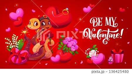 Be my Valentine greeting card with cute snakes couple and gifts, romantic love holiday. Cartoon snakes characters hugging with pink hearts, flowers, gift boxes and wedding ring, Valentines love card