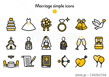 A collection of wedding icons featuring rings, couples, cakes, churches, and gifts