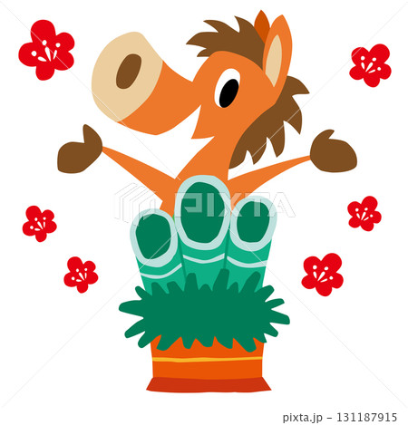 手描きのゆるい午年キャラクター(干支、門松、正月飾り)