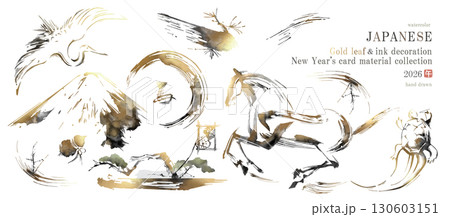 2026年 午年 年賀状「馬と富士山と縁起物の鶴亀の金箔をあしらった筆書きセット
