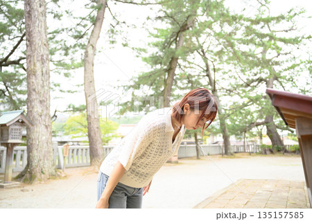 神社で深くお辞儀する女性