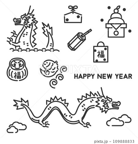 シンプルな黒色のラインアート 年賀状素材セット