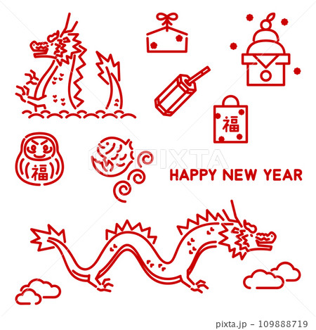 シンプルな赤色のラインアート 年賀状素材セット